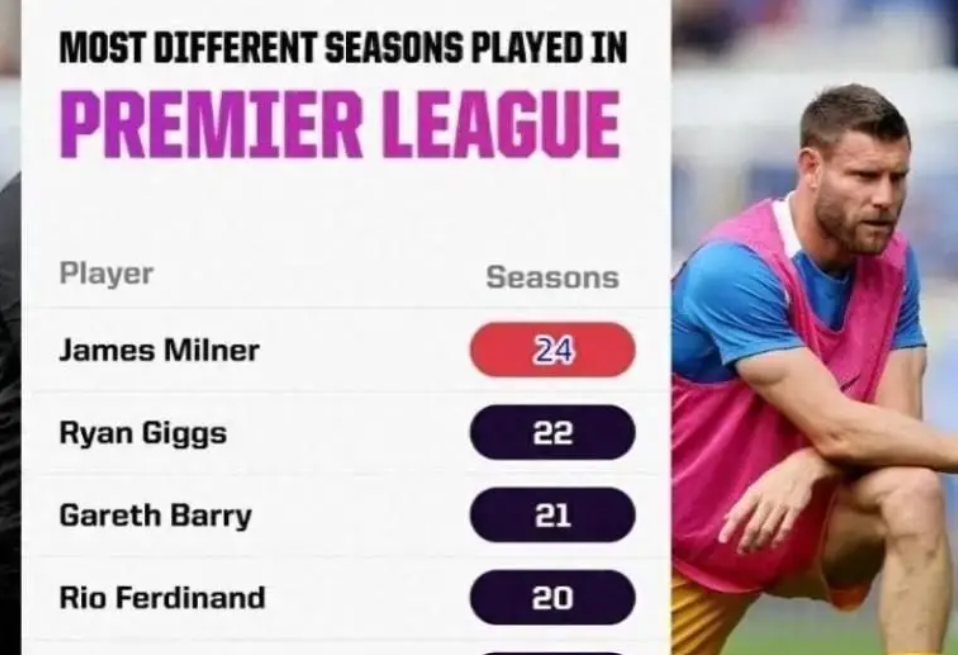 米尔纳早已超越吉格斯、巴里和费迪南德等名宿,成为英超历史上出场赛季最多的球员-9。当这两项纪录集于一身时,这位曾在曼城和利物浦获得英超冠军、在利物浦赢得欧冠奖杯的传奇球员,将被永远镌刻在英超丰碑上。